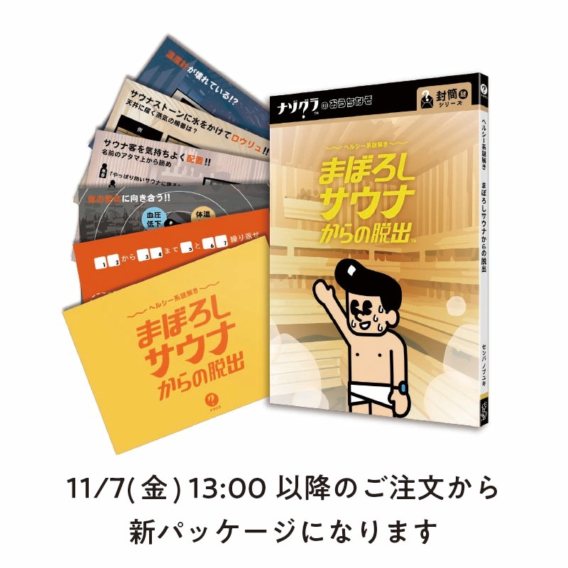 封筒の中には様々な謎が記されたポストカードが5枚。アナタをサウナに閉じ込めたサウナゾ君の視線を感じながら、全ての謎を解き進めましょう!ビギナー向けの難易度ですが、やりごたえは抜群。のぼせてしまう前に、なんとしても脱出しよう!
