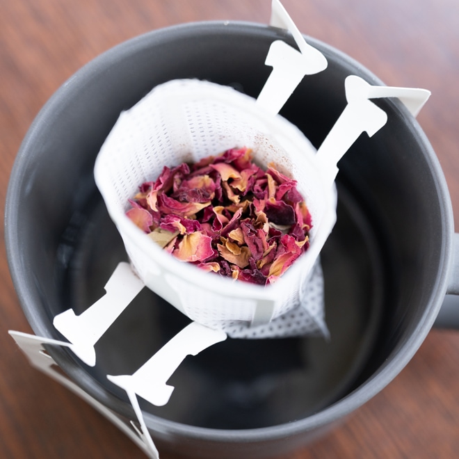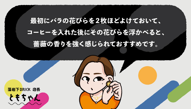コーヒー豆は、ClaGla直営カフェ「藻岩下BRICK」で焙煎したオリジナルブレンド。 薔薇のフローラルはまるで紅茶のようにふくよかに香り、続いて広がるコーヒーの風味は苦味が少なく、やわらかな柑橘感のあとにスパイスの余韻が続く、チョコやナッツを思わせる味わいとなっています。 口に含むたびに、紅茶とコーヒーを行き来するような不思議な体験を楽しめます! 氷砂糖や角砂糖を半分ほど加えると、よりジューシーになり、双方のフレーバーがいっそう際立ちます。